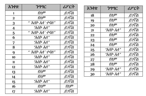 በሰንጠረዡ ውስጥ የምናየው የ‘ሪፖርት’ ገናናነትን ነው። የአስኮ ንግግር የሚመዘገበው በአብዛኛው በዚህ ዘዴ ስር ነው። አስኮ መናገሩ ብቻ አይደለም። ‘ምን ያህል ተናግሮአል?’ ብለን መጠየቅም አለብን። በሌላ በኩል አኀዝ (Quantity) ለብቻው የጥልቀትም መለኪያ አይደለም። የጥራታዊ ፈረጁንም (Quality) መርሳት የለብንም።